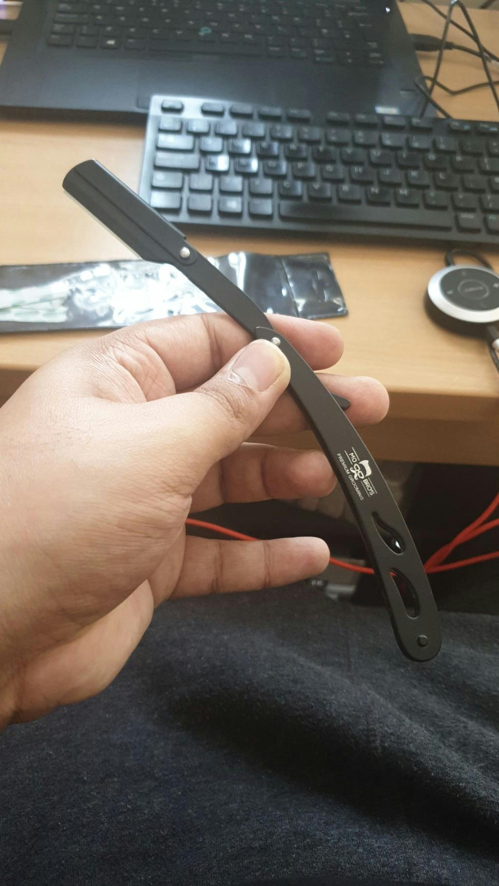 my latest purchase was the black cut throat which is peefect. it comes with 5 disposable blades and the feel of the cut throat is smooth and easy to handle.